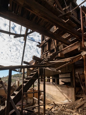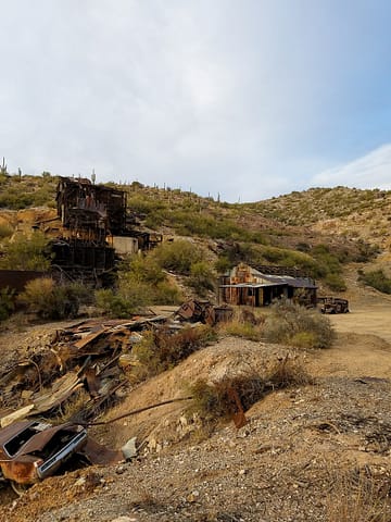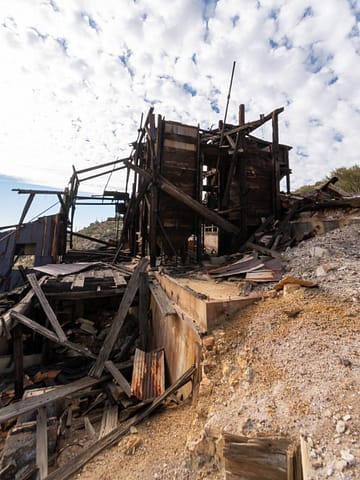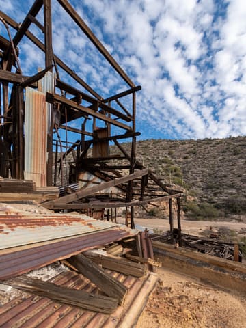 The 79 Mine was initially claimed within Pinal County in 1879, as Gila County did not exist until 1881. Like many medium and small-sized mining operations, the mine went through many owners and operators throughout its producing years. Now most known for its spectacular copper and lead mineral specimens, mineral collectors most recently mined for these specimens in the late 1990s. The remains of the operation include dilapidated processing and crushing facilities along with a headframe and old ruined house.